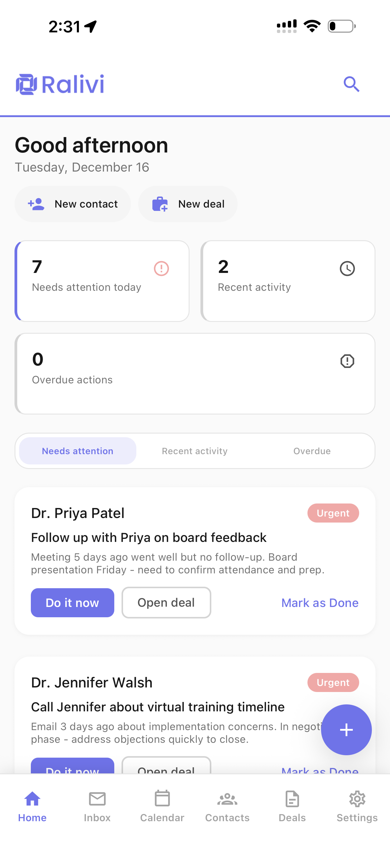No more wondering what to work on. Every morning, Ralivi shows you exactly who needs attention and why, prioritized by urgency and opportunity.